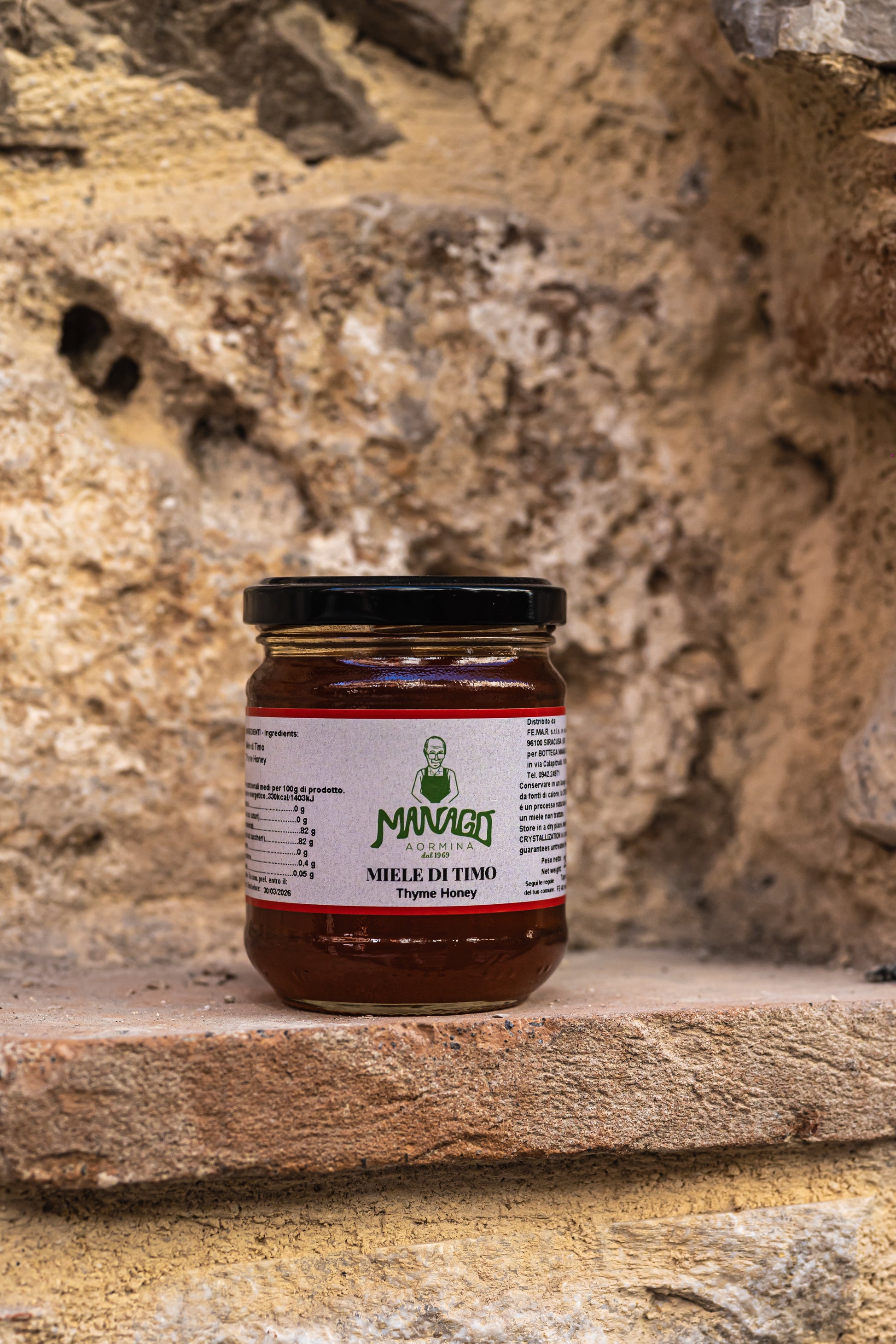 Il Miele di Timo Managò è un prodotto straordinario che racchiude tutta l'essenza aromatica della macchia mediterranea. Le api raccolgono il nettare dai cespugli selvatici di timo (conosciuto in Sicilia come satra) che fioriscono sotto il caldo sole estivo, in particolare nelle zone collinari e montuose dell'isola. Questo miele pregiato si presenta con un colore ambrato che diventa più chiaro cristallizzando, ed è celebre per il suo profumo floreale molto intenso. Al palato sprigiona un sapore ricco, persistente e avvolgente, caratterizzato da note balsamiche e leggermente speziate che lo rendono inconfondibile e particolarmente ricercato.